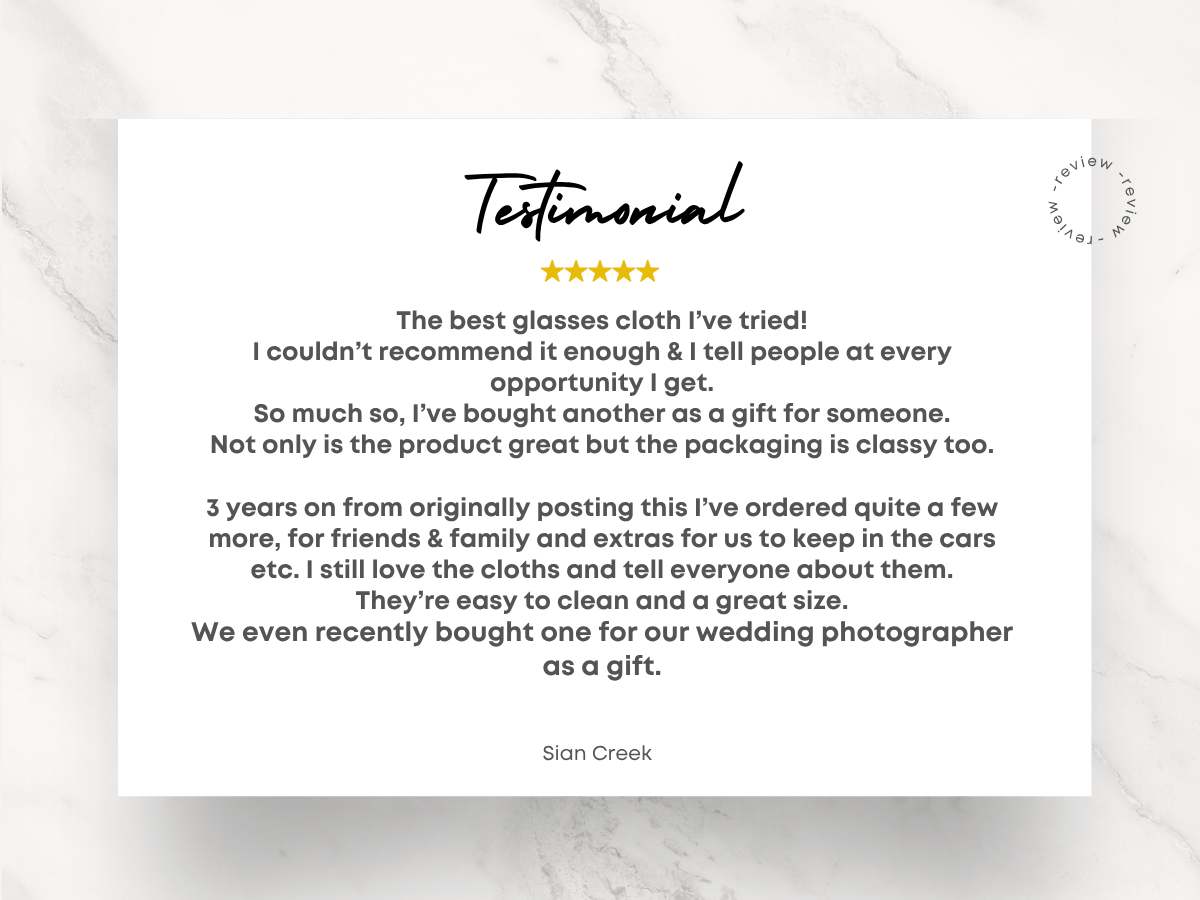 Our Cloths are also designed to keep your wine glasses sparkling clean and scratch free. The microfibre cloth will quickly remove dust, streaks and fingerprints from the surface of your glass, whilst drying at the same time. The cloth produces no excess fluff, fibre or lint.